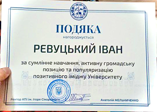 З нагоди Міжнародного дня студентів у КПІ ім. Ігоря Сікорського відзначено 127 найактивніших студентів університету. Серед нагороджених – магістранти 1 курсу кафедри інформаційно-вимірювальних технологій Поліна Васюк та Іван Ревуцький.